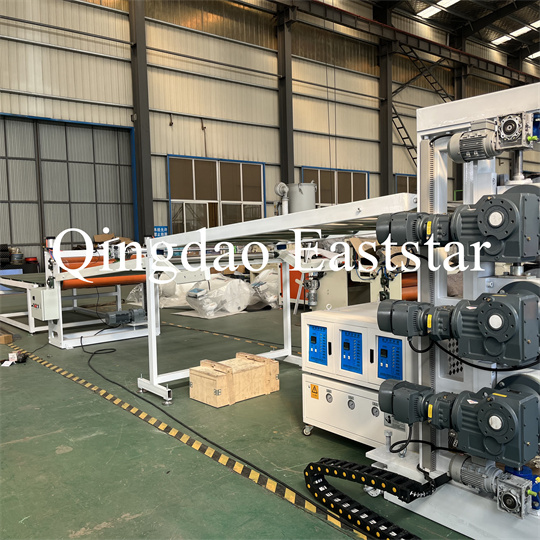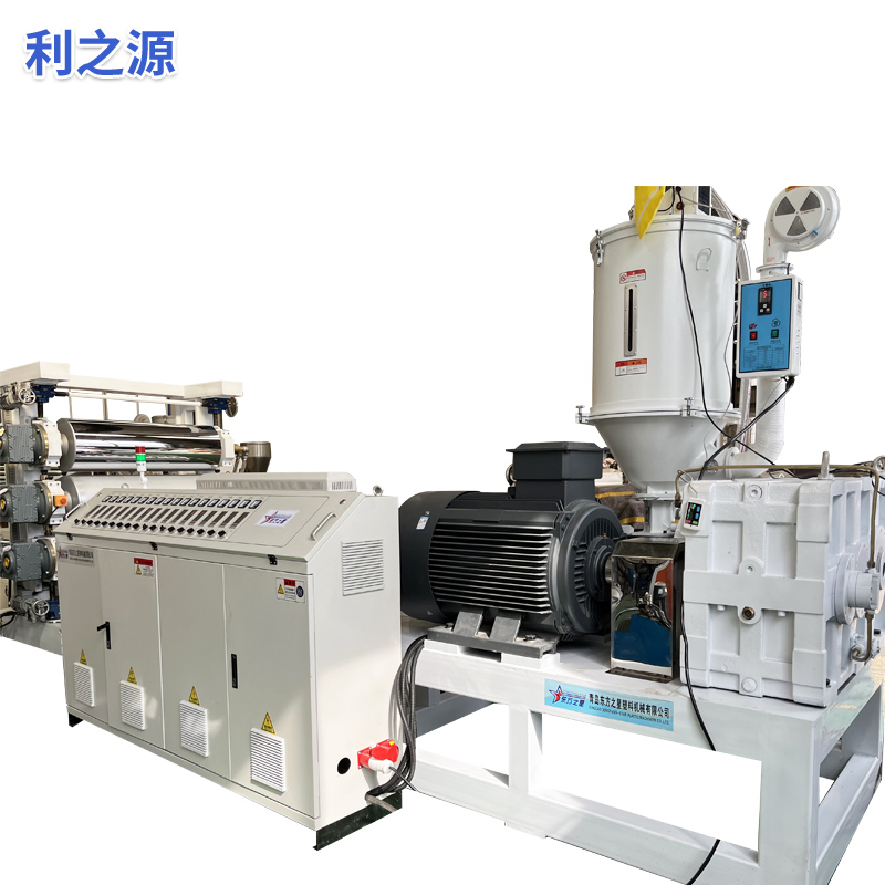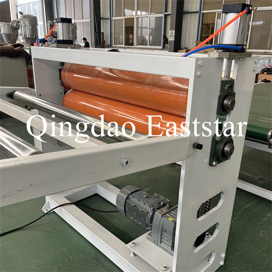 Équipement d'extrudeuse de plaques antidérapantes en PVC souple : L'équipement se compose principalement d'une extrudeuse à vis unique, d'une calandre à trois rouleaux, d'un refroidissement de 6 mètres