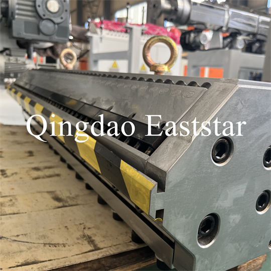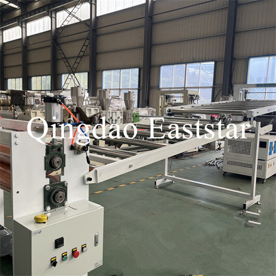 Équipement d'extrudeuse de plaques antidérapantes en PVC souple : L'équipement se compose principalement d'une extrudeuse à vis unique, d'une calandre à trois rouleaux, d'un refroidissement de 6 mètres support, une machine de traction à rouleaux en caoutchouc, une cisaille et un dispositif à bande transporteuse.