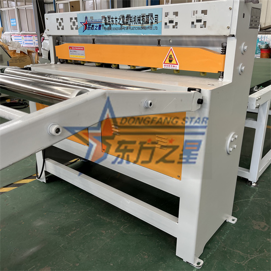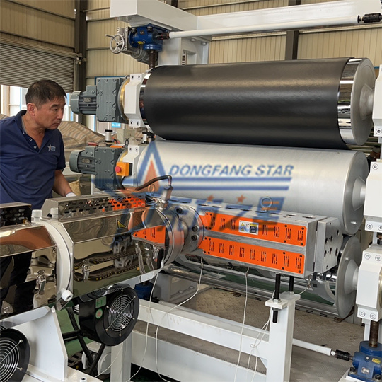 Équipement d'extrudeuse de feuilles antistatiques en PVC : L'équipement se compose principalement d'une extrudeuse monovis 120, d'une calandre à trois rouleaux, d'un support de refroidissement, d'une machine de traction à rouleaux en caoutchouc, d'une cisaille et d'un
