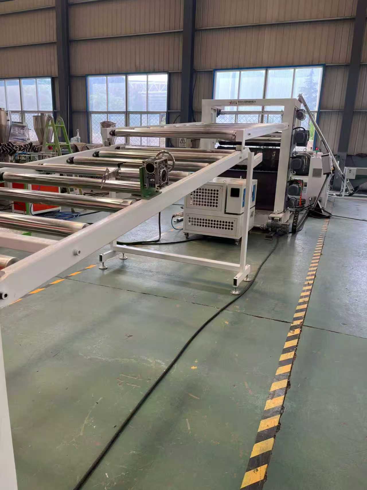 Ligne de production d'extrusion de tuyaux renforcés de fil d'acier PVCTapis de sol de voiture d'équipement de tapis antidérapant TPE-1000 mm : L'équipement se compose principalement d'une extrudeuse à vis unique, d'une calandre à trois rouleaux, d'un support de refroidissement de 6 mètres, d'une machine de traction à rouleaux en caoutchouc, d'une cisaille et d'un dispositif de bande transporteuse.